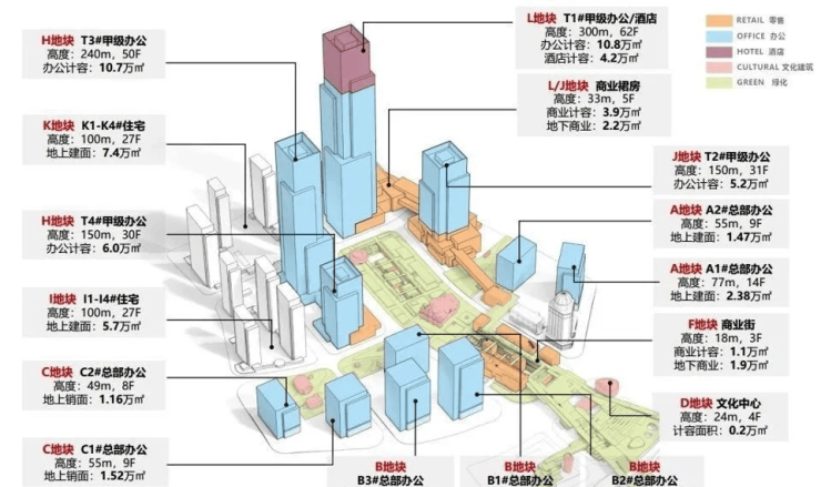 复合业态:约46万方超高层企业总部办公楼,约17万方大型商业中心,约4.2万方丽思卡尔顿酒店,约12万方高端住宅,6大公园(花桥空中花园、教堂花园、会馆花园、百草园、健康花园、中央花园),近180年董家渡天主教堂、300余年商船会馆。