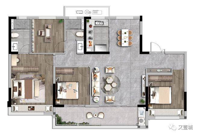 建面约130㎡的户型,设计成户型中利用率比较高的四叶草格局,主动线位于住宅中央,四个房间位于住宅四角,相互独立不干扰。