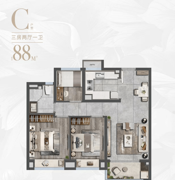 项目总建筑面积约12.5万方,总规划8栋14F和3栋16F小高层,涵盖建筑面积约88/95㎡三房、约99㎡三房和约133㎡四房“全龄全时成长型”户型。