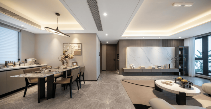 客厅是白天家人们停留时间最长的空间,悦东上境府精研家庭生活,布局阔绰客餐厅,家人欢聚、招待亲友、周末派对等日常热闹而不拥挤,同时考究精致细节,方寸彰显高级品味。
