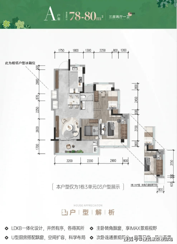 A户型78-80㎡3房1卫: