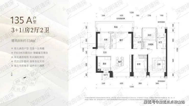 134㎡的4房2厅2卫,A户型(1栋1/2单元05户型),设计的是竖厅南北通透格局,进门入户玄关,客厅4.2米开间,LDKB一体化设计,四开间朝南,4个卧室分别做到了主卧19.44㎡/次卧10.64㎡/次卧10.26㎡/次卧7.8㎡(包含墙体飘窗),客厅连接次卧出6.8米长的观景大阳台看深大校区,U型厨房,卫生间干湿分离,得房率约90%(包含赠送),西北朝向。
