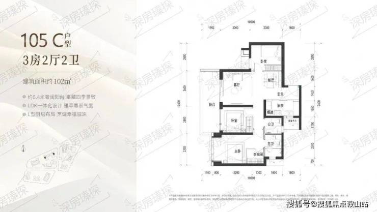 105㎡的3房2厅2卫,B户型(2栋3单元02/06户型),设计的是经典竖厅格局,客厅3.6米开间,LDKB一体化设计,三开间朝南,动静分区,3个卧室分别做到了主卧13.12㎡/次卧9.9㎡/次卧8.4㎡(包含墙体飘窗),客厅连接次卧出6.4米长的宽景大阳台,U型厨房,卫生间干湿分离,得房率约90%(包含赠送),正南或东南朝向。102㎡的3房2厅2卫,C户型(1栋1/2单元02户型),设计的是竖厅格局,客厅3.6米开间,LDK一体化设计,3个卧室分别做到了主卧16.93㎡/次卧9.24㎡/次卧8.96㎡(包含墙体飘窗),客厅连接次卧出6.4米长的宽景大阳台,U型厨房,卫生间干湿分离,得房率约90%(包含赠送),西南或东北朝向。