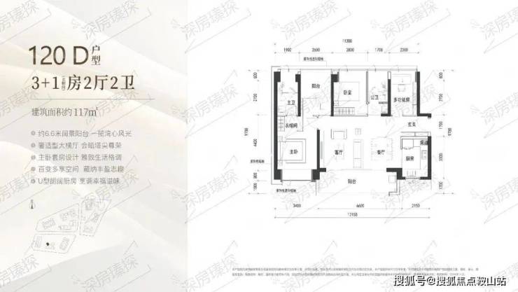 118㎡的4房2厅2卫,A户型(1栋1/2单元01户型),设计的是横厅格局,进门入户玄关,客餐厅6米开间,LDKB一体化设计,4个卧室分别做到了主卧17.65㎡/次卧11.02㎡/次卧9.12㎡/次卧8.74㎡(包含墙体飘窗),客餐厅出6米长的观景大阳台看深大校区,U型厨房,公卫三段式分离,得房率约90%(包含赠送),西北朝向。