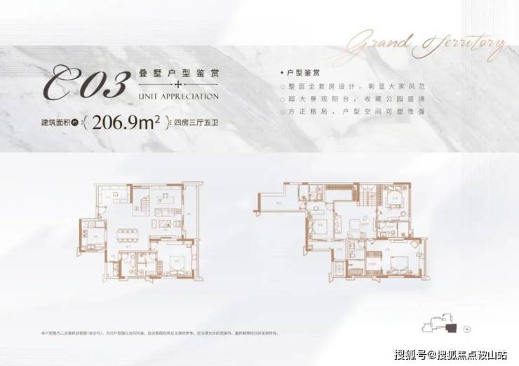 设计亮点:私家电梯入户、全屋套房布局、6米宽景观阳台,实现“有天有地有花园”的居住体验。