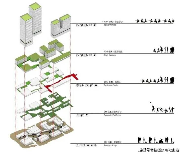 项目根据企业的发展阶段及需求,将园区分层处理。底层打造活力商业街区;向上依次为中小型企业,大中型企业,大型企业及伟大企业。整个标段从下到上,公共度递减,私密度递增,使用人群各取所需,最大化提升产品附加值