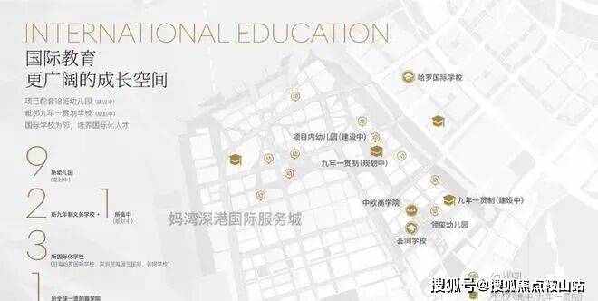 项目周边拥有15所幼儿园、4所义务教育学校,还有荔湾小学和深大附中等学校都在周边。此外项目靠近多所国际学校,拥有3000到5000个名额,包括荟同国际学校、礼德国际学校、英国国王学校(深圳分校)以及深圳哈罗国际学校。临近小区南侧有一块九年制教育用地,但目前未招标。入住早期可能要到妈湾南二外学校或者前湾南二外学校上学。