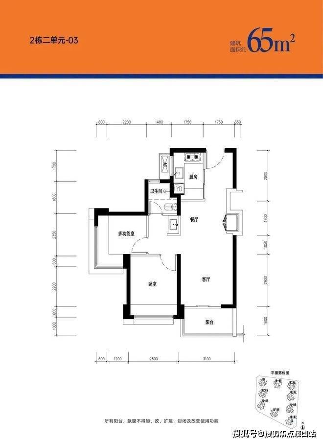 65㎡的2房2厅1卫,设计的是竖厅格局,LDKB一体化,客厅3.1米开间,S墙设计预留冰箱卡槽位,2个卧室分别为2.8/2.35米的宽度,U型厨房,得房率:77.27%(不含赠送),阳台进深1.6米,东北朝向。