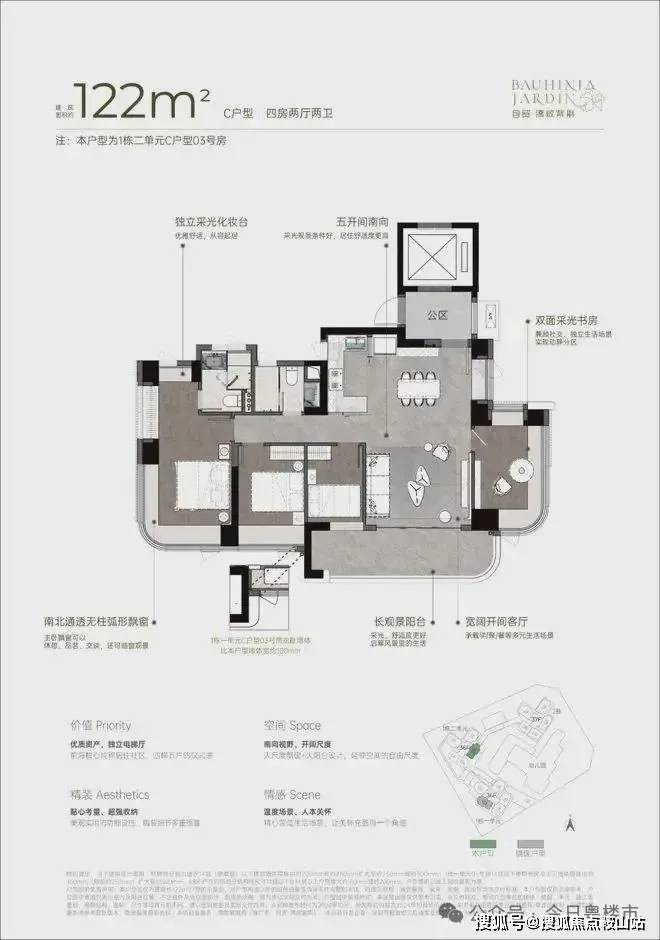 双龙抱珠户型,整个户型非常通透。书房分布于客厅另一侧,难得的双面采光+270°景观视野。主卧南北通透,景观面开阔。
