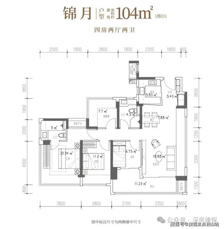 104㎡的4房2厅2卫,设计的是竖厅格局,客厅4.15米开间,LDKB一体化设计,预留冰箱卡槽位,四开间朝南,动静分区,主卧270°无柱转角飘窗还带1个设备平台约1.52平,分别做到了主卧20.34㎡/次卧11.2㎡/次卧7.7㎡/次卧6.75㎡(包含墙体飘窗),U型厨房烟道外置,卫生间干湿分离,得房率约100.71%(包含赠送),客厅连接次卧出大阳台约11.23平,西南朝向。