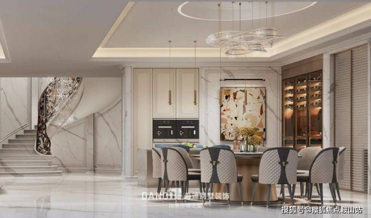 整体空间设计遵循“分层而居,各得其所”的理念,打造动静分明、功能完善的居住格局,兼顾社交排场与私密生活。一层规划为开放式公共社交区,挑高客厅搭配全景落地窗,将海景与空间尺度拉满,成为居者会客、聚会的核心场域,客餐厨一体化设计让动线更流畅,既满足高端社交的体面需求,又能承载家人日常互动的温暖。