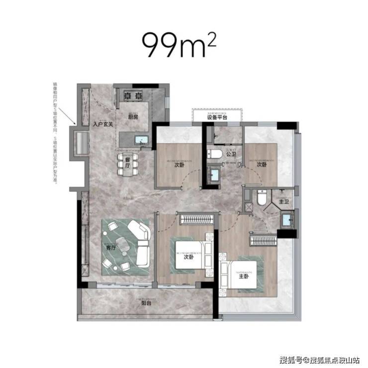 99㎡的4房2厅2卫,设计的是竖厅格局,得房率约79.5%(不含赠送),套内面积79.29㎡,客厅连接次卧出9.37m²大阳台西南或东南朝向。靓点:99平做到了4房2卫,主卧270°无柱转角飘窗,厨房烟道外置+额外赠送设备平台,并且是纯南向格局。
