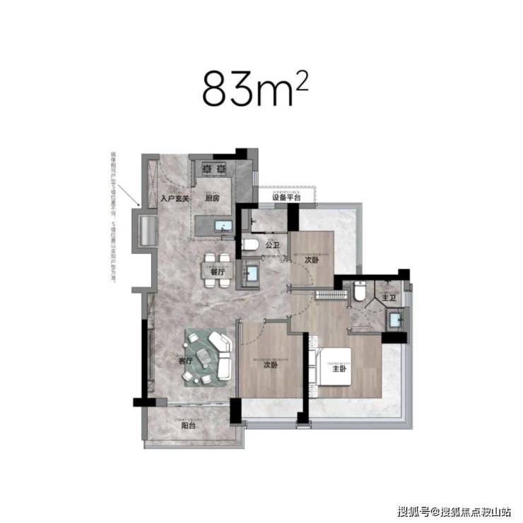 83㎡的3房2厅2卫,设计的是经典竖厅格局,得房率约77.9%(不含赠送),套内面积64.28㎡,阳台5.02m²西南或东南朝向。靓点:83平做到了3房2卫,主卧270°无柱转角飘窗,厨房烟道外置+额外赠送设备平台,并且是纯南向格局。
