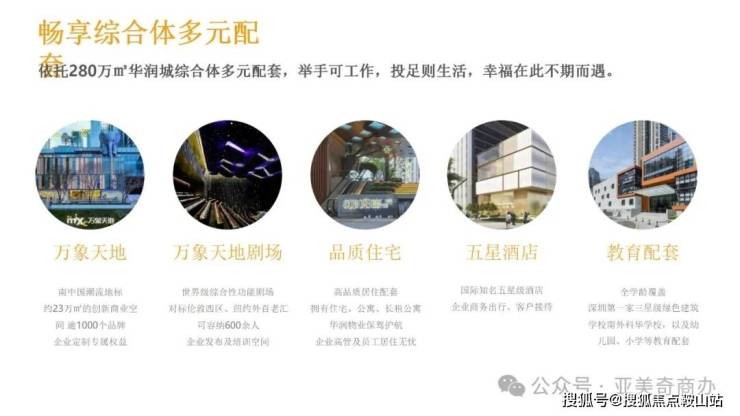 该项目旨在打造成为中国具有昭示性和影响力的商务群落。以“城市人文综合体”华润城为依托,约280万平方米华润城多元核心配套─“创新升级版万象城”万象天地、城市高端住宅润府、精品公寓、五星级酒店、诚品生活/书店、人文剧场等。