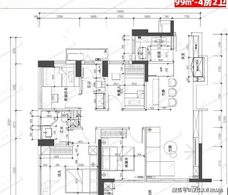 99㎡的4房2厅2卫,设计的是竖厅格局,客厅3.35米开间,LDKB一体化,S墙设计预留双开门冰箱卡槽位,三开间朝南,动静分区,U型厨房,公卫三段式干湿分离,赠送设备平台,得房率约78.27%(不含赠送),客厅连接次卧出9.37m²大阳台西南或东南朝向。靓点:99平做到了4房2卫,主卧270°无柱转角飘窗,厨房烟道外置+额外赠送设备平台,并且是纯南向格局。