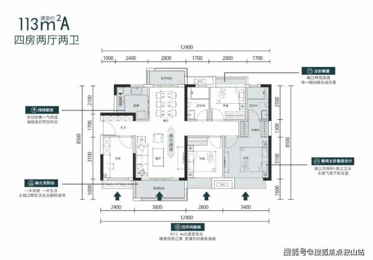 建面约113㎡的四房两厅两卫,空间利用率极高,南北双阳台,全屋飘窗设计,四开间朝南,奢阔主卧套房设计,独立衣帽间,更显主城气度。
