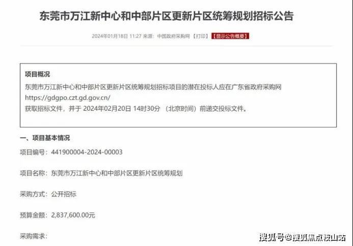 2024年1月18日,中国政府采购网发布《东莞市万江新中心和中部片区更新片区统筹规划招标公告》,万江已明确万江新中心片区及中部片区为“双轴”的重要组成部分,将进行片区统筹规划建设,正启动“片区统筹规划服务商”招标。