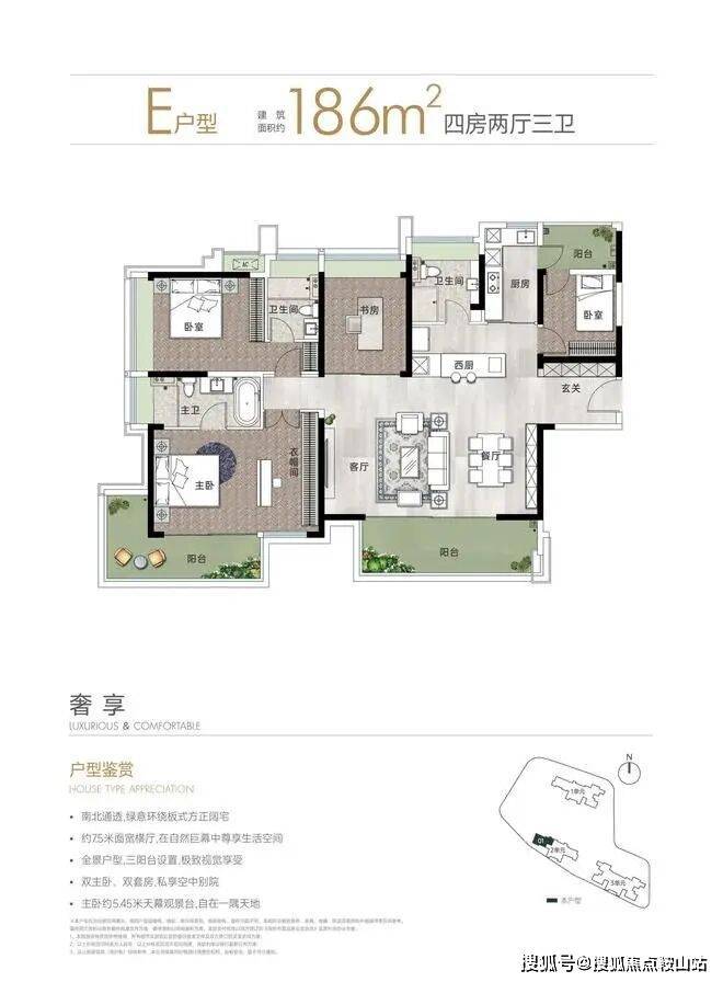 设计的是竖厅南北通透格局,双阳台,进门入户玄关,LDKB一体化设计,动静分区,四开间朝南,L型厨房还带1个小生活阳台,卫生间干湿分离,得房率约78.72%(不含赠送),客厅阳台主朝西南向。