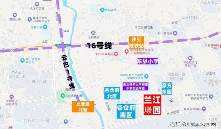 兰江璟园,位于坪山区石井街道比亚迪路豪方东园西侧,项目南侧是坪山比亚迪厂区,还有比亚迪六角大楼,西侧是方直谷仓府,北侧紧挨着东北师范大学附属中学深圳学校,16号地铁线“沙壆站”距离约400米。