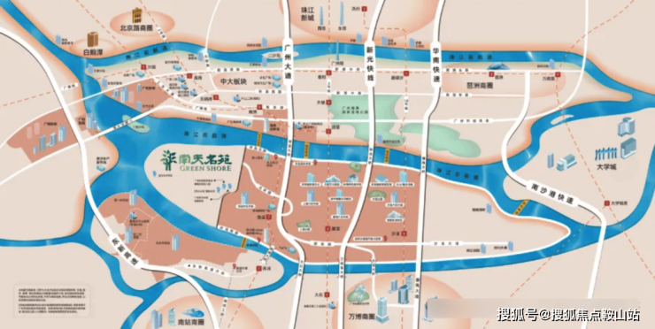 南天名苑地处洛溪岛,该岛是继二沙岛之后,市中心第二个中轴岛,位于城市中轴与珠江后航道的交汇处,且处于珠江后航道高端豪宅居住带上。2018 年,洛溪岛纳入主城区核心地段,广州中轴南移至此,形成了独特的城市中轴景观。