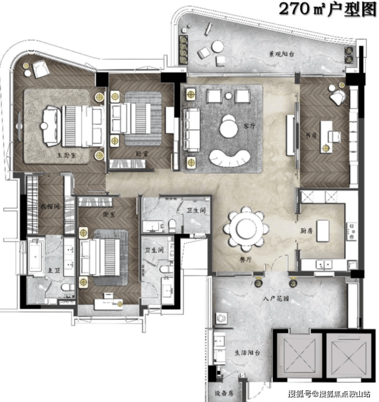 270㎡环幕江景四房(A 户型):王牌户型,拥有约 9 米超大邮轮式阳台,一线望江无遮挡。专梯专户设计,配备墅级空中双花园和约 28㎡超大私家庭院。约 42㎡超大主卧空间,270° 环幕江景,阔绰双主套房设计,居住体验奢华。