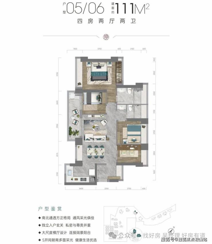 得房率约75.4%(不含赠送),朝向为西南或东南,可看一期小高层或阳台山景观。