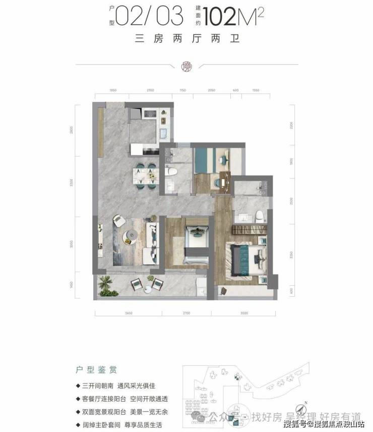 102㎡户型同样采用经典竖厅格局,客厅开间3.7米,三开间朝南。