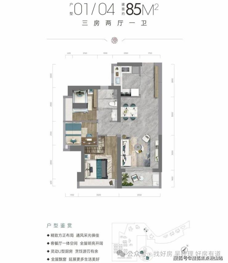 85㎡户型设计为竖厅格局,客厅开间3.6米,采用LDKB一体化设计,实现动静分区。
