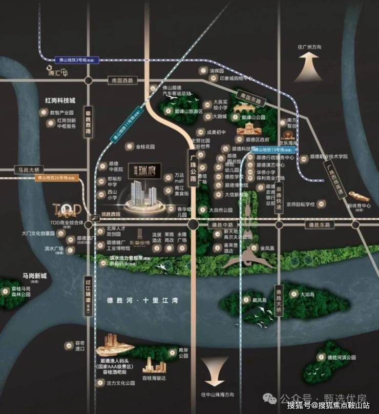 二、【雄踞“德胜河”龙头,坐享千亿资源】鎏金湾·瑞府位于“德胜休闲湾”,正在处容桂水道、德胜河和顺德支流三江交汇成湾,城市规划上占据“顺德推进中心城区八大平台”之三:105黄金走廊(红岗科技城)、顺德工业历史文化带(德胜北岸顺德糖厂活化工程)以及马岗智造新城;与顺德CBD德胜新城紧密连接,形成集科技、人文、行政、商业、生态五位一体,且具备顺德特色的湾式经济圈——顺德湾!