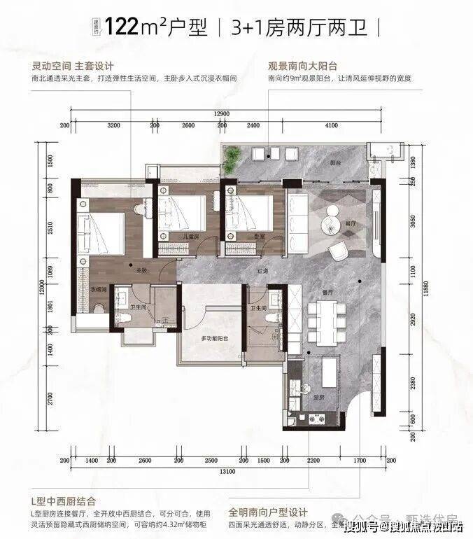 九、【LDKB无界一体化 享受“大平层”尺度】创新”LDKB+X空间”设计理念,客厅、餐厅、厨房、阳台+多功能空间一体化设计,满足家庭休闲、饮宴、社交、会客等功能,探索家的N种可能性,营造打动人心的生活场景。