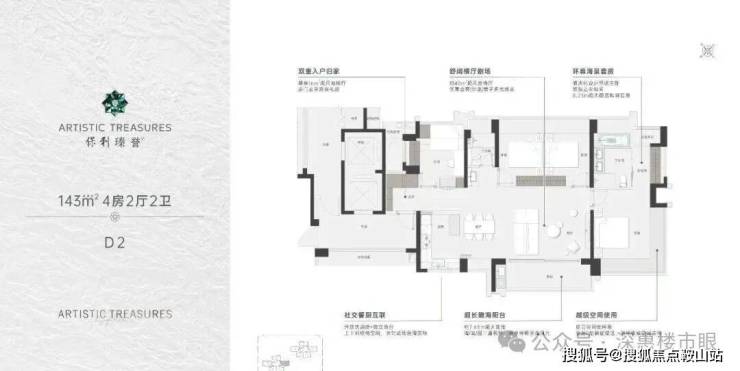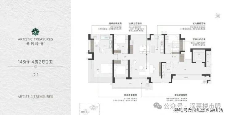 143㎡的4房2厅2卫,D1户型(03),设计的是竖厅南北通透格局,独立专梯入户,送约12㎡的私用公区,客厅5.7米开间,LDKB一体化,四开间朝南,4个卧室分别做到了主卧28.2㎡/次卧9.38㎡/次卧9.24㎡次卧9.2㎡(包含墙体飘窗),客厅连接次卧出6.5米长的瞰海大阳台,L型岛台式厨房,卫生间干湿分离,得房率约77.7%(包含赠送),西南朝向看海景。套内面积111.7㎡+赠送29.8㎡=实用面积141.5㎡,加上得房率约98.41%(不含公区)。