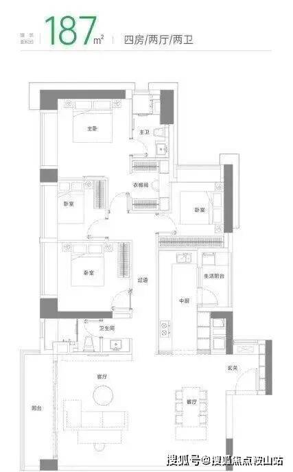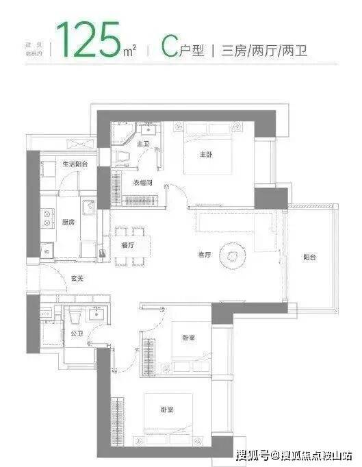 缺点是,两侧单面采光设计,没有侧向采光面,主卧为暗卫,厨房和公卫采光差。