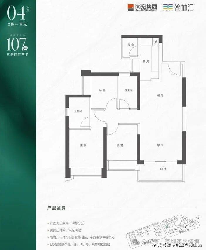 采用竖厅格局,客厅开间3.4米,实现LDKB一体化设计。L型厨房配备小生活阳台,卫生间采用三段式分离设计。得房率约71%(不含赠送部分),朝向为西南或东南。