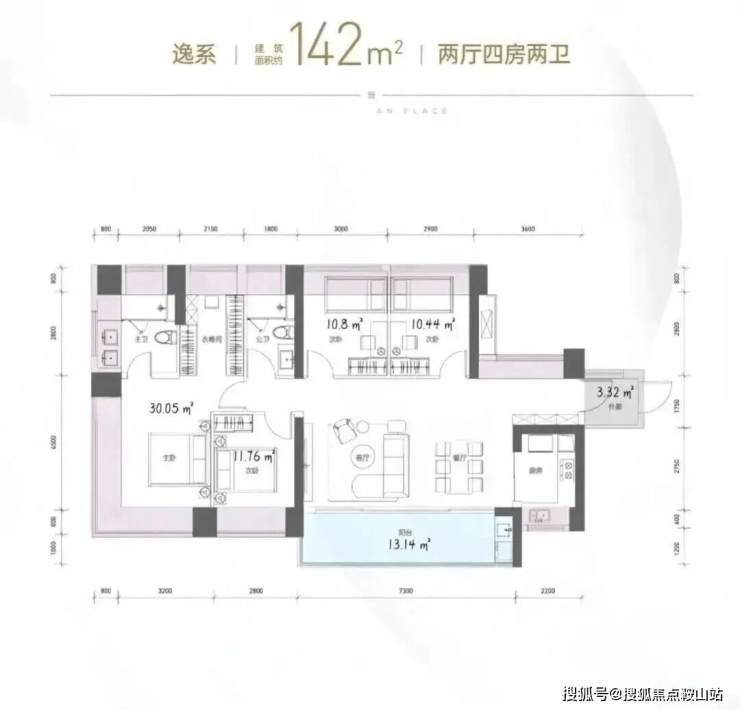 高配版本四房两卫。南北通,开间7.3m的超大客厅和阳台。包含外廊的实用率高达102%,家里如果人多,衣帽间也能改造成一个小房间或者书房。