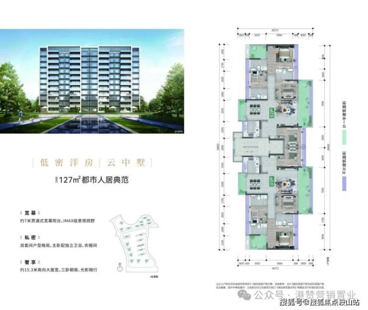 地平线提高,提升小区大门气势,增强归家仪式感,契合“人往高处走的喻意”;天际线高度达100米,印证豪宅的属性;