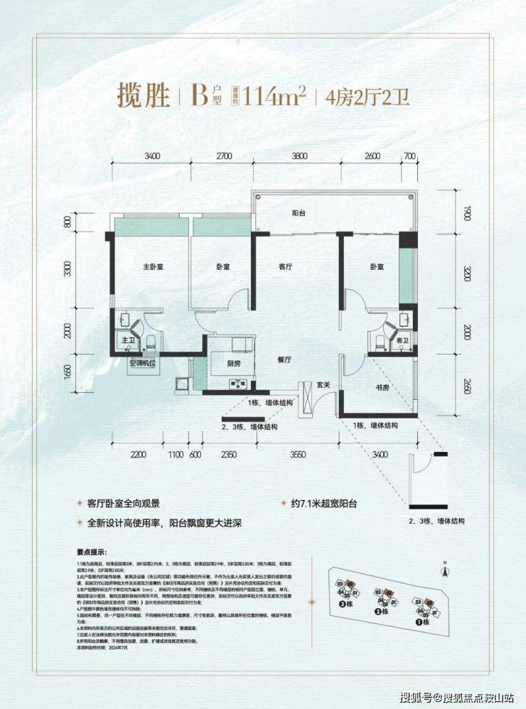 项目定位高端改善,精心采用了蝴蝶造型的楼栋设计方案,把每一栋楼都打造成“单栋式板楼”,实现户户相互错开,最大化程度减少对视。项目80%都是四房户型,该户型可鸟瞰公园全景,锻造出与自然相融相生的高端人居作品。在户型设计方面,项目按照深圳建筑设计新规进行打造,是光明首批新规报建的高实用率楼盘。主力户型建筑面积为113到141平方米4房,飘窗更大、阳台更宽、户型实用率更高,打造高端纯粹的居住氛围。