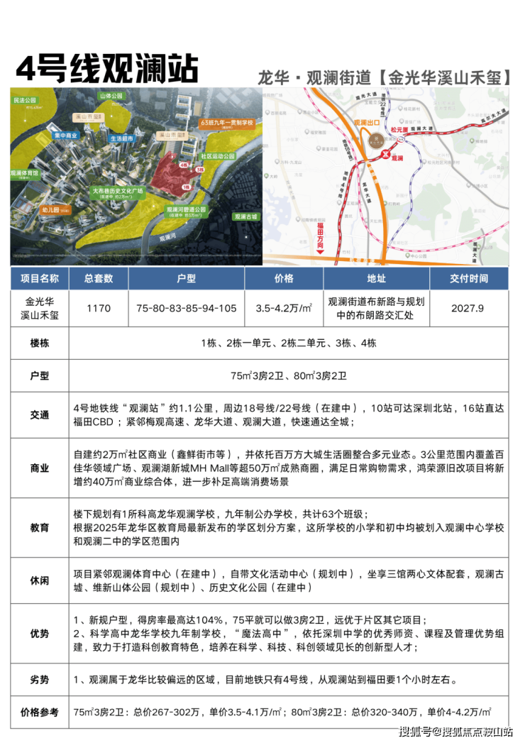 交通便捷,自驾临近梅观快速、沈海高速,通达全城;未来 22 号线鹭湖站开通,双轨加持,通勤效率大幅提升。金光华深耕深圳 29 年,品牌稳健,2026 年底带简装交付,配备中央空调与一线厨卫,交付有保障。项目为观澜销冠,市场认可度高,长线价值可期。
