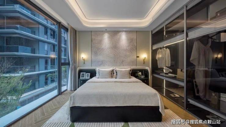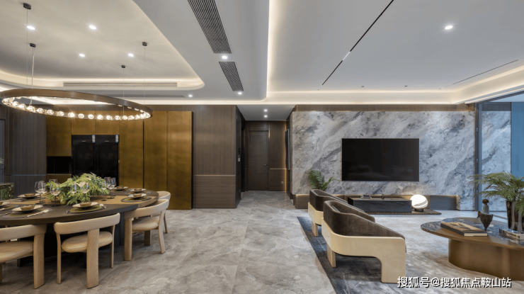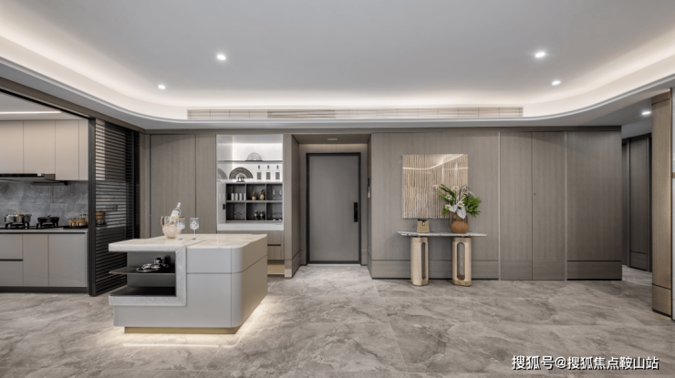 其中约143㎡B1户型做到4房3卫,三卧室朝南,采用约7米面宽的客餐一体横厅,动线清晰流畅。客厅背景墙处舍弃常规大理石材料,采用米白色系岩板来升华空间整体格调,既不会过于刺眼也不会显得沉闷,给人一种平静舒适的感觉。客厅采用超大落地窗,确保了开阔的视野与充足的自然光线。独立的岛台和mini bar不仅丰富了客厅的功能性,其独特的导光板材质也为房间增加低调的奢华气质。