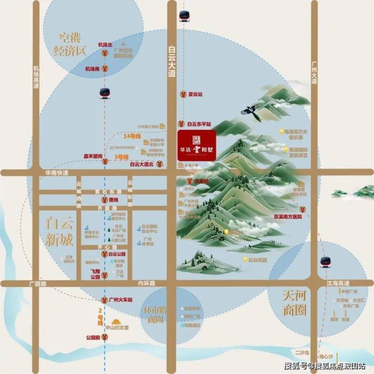 项目位于白云大道北,依托白云山这一独特的自然景观,成为广州的豪宅新高地。白云山不仅是广州的城市核心资产,也是岭南文化的重要象征,历史上许多名人均在此留下足迹。随着白云大道北的改造升级,华远·云和墅的地理位置优势愈加显著。项目距离白云国际机场约23公里,10分钟车程即可到达白云CBD,20-30分钟即可到达广州天河、越秀等核心商圈,交通便捷,方便业主快捷出行。