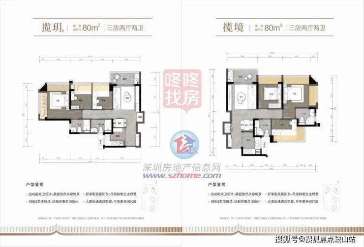 建面约80㎡的揽玥和揽境,三房两厅两卫,小面积段里双卫配置,功能全面。客厅出阳台,约1.5m进深,兼顾家政空间功能。东北朝向可观虹桥公园、大顶岭山林公园等生态景观,视野开阔。