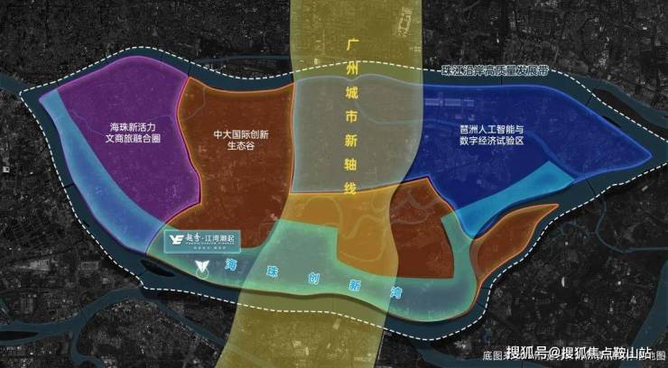 三轴交汇:广州新城市中轴+珠江后航道+中大国际创新谷,定位湾区滨水发展核心区。
