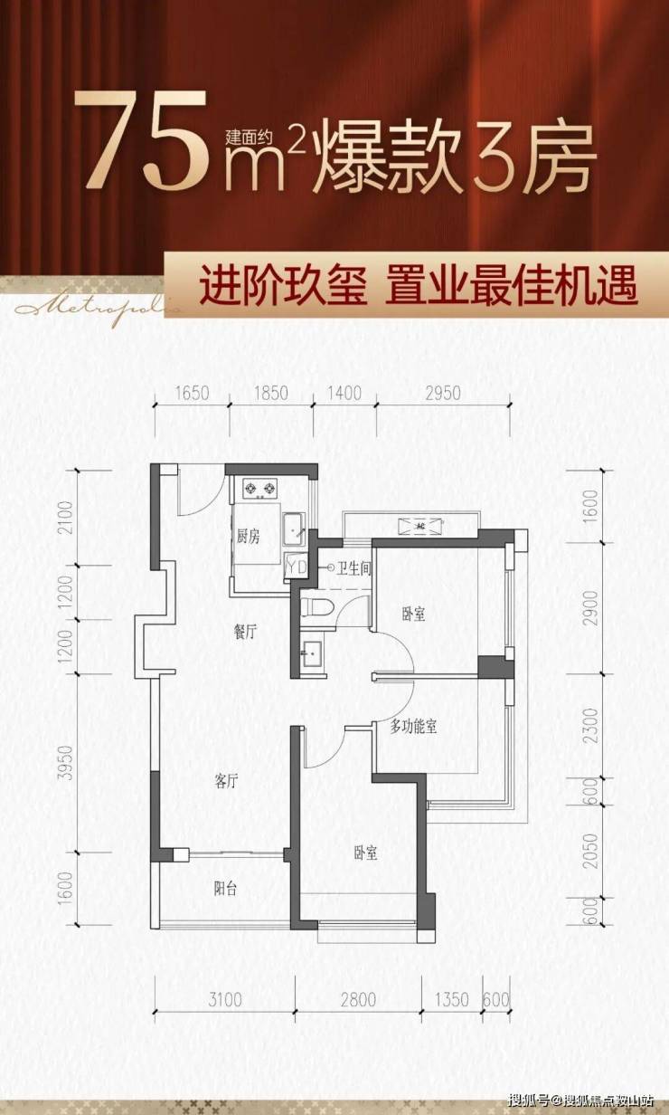 75㎡的3房2厅1卫,设计的是竖厅格局,客厅3.1米开间,LDKB一体化,S墙设计预留冰箱卡槽位,3个卧室分别做到了主卧10.2㎡/次卧8.55㎡/次卧7.95㎡(包含墙体飘窗),U型厨房,卫生间三段式分离,得房率约77%(不含赠送),西南朝向。
