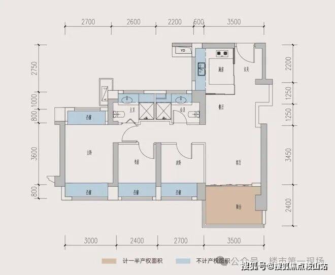 3房2厅2卫,西南向,竖厅格局,客厅3.5米宽,三开间朝南。主卧15.1㎡带270°飘窗。赠送面积16.96㎡,得房率96.84%(含赠送)。