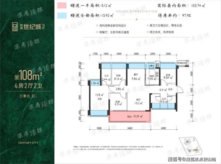 108㎡的4房2厅2卫,设计的是竖厅南北通透格局,客厅3.8米开间,客餐厅分离设计,全屋10面飘窗,四开间朝南,4个卧室分别做到了主卧15.16㎡/次卧8.84㎡/次卧8.16㎡/次卧6.5㎡(包含墙体飘窗),U型厨房,公卫创新式三段式分离,阳台10.24㎡主朝正南向。得房率约97.9㎡(包含赠送),赠送面积有21.04㎡。