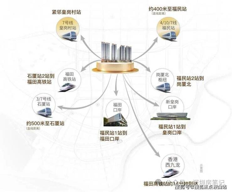 地铁7号线皇岗村站就在家门口,步行100米。往西一站到石厦站换乘3号线,往东一站到福民站换乘4号线和10号线,4条地铁线环绕。2站到皇岗口岸或福田口岸,过关去香港分分钟的事。福田高铁站2站,14分钟到香港西九龙。