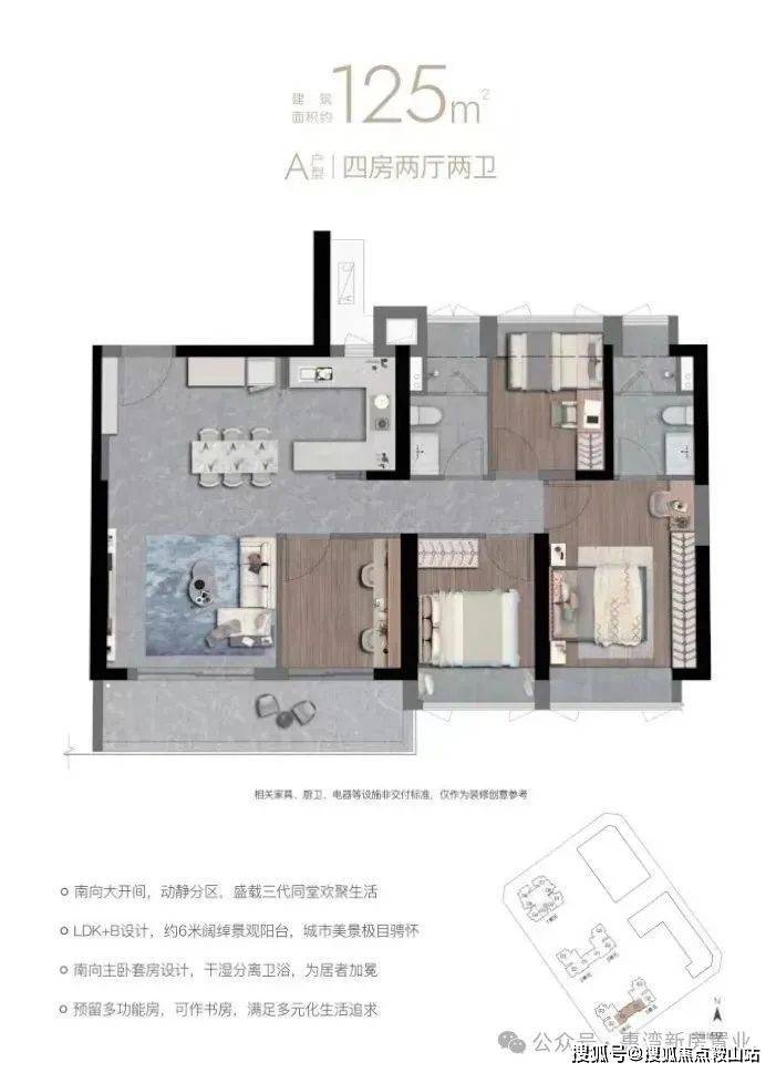 而建面约125㎡的4房2卫户型观感会舒适很多,虽然同样无法摆脱次卧要“睡飘窗”,客厅开间也没有很大,但如果做3房设计的话,舒适性会有所提高,整体功能性也会提升不少。