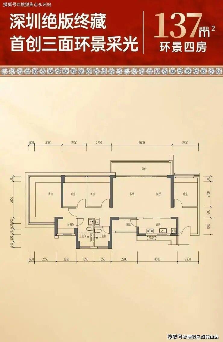 137㎡的4房2厅2卫,设计的是横厅南北通透格局,客餐厅6.6米开间,LDKB一体化,4个卧室分别做到了主卧19.35㎡/次卧9.54㎡/次卧9.04㎡/次卧8.88㎡(包含墙体飘窗),一字型厨房带1个生活阳台,公卫三段式干湿分离,得房率77.3%(不含赠送),客餐厅出6.6米长的观景大阳台,东南或西南朝向。套内面积105.61㎡+赠送面积23.19㎡=实得128.8㎡,加上赠送后得房率94.28%。