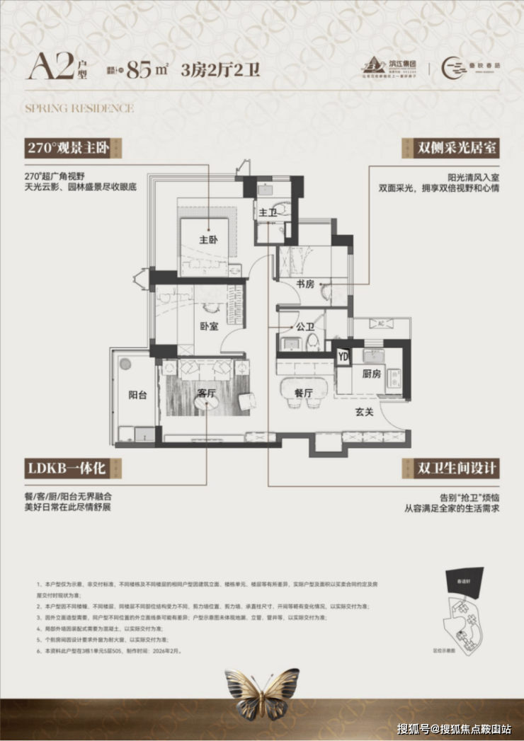 85-95㎡ 三房两卫(刚改主力)主流刚改首选,南北通透,动静分区,主卧270°转角飘窗,U型厨房+干湿分离卫浴,实用至上,得房率约96%-98%,赠送空间足
