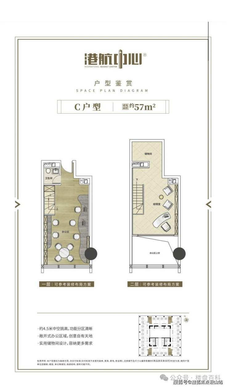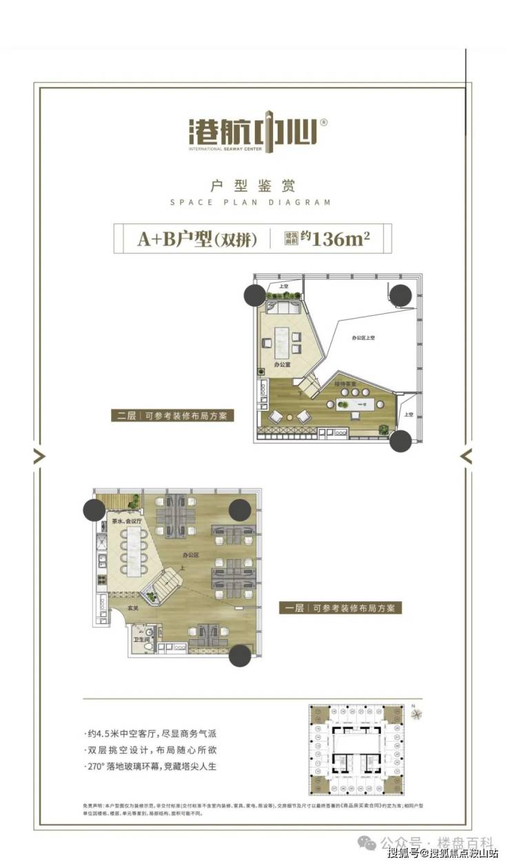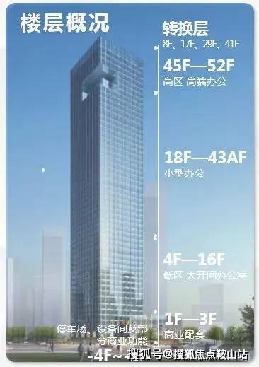 每层层高:4.5米(1楼约16米高豪华办公大堂,46层配备18米挑高瞰江空中花园)