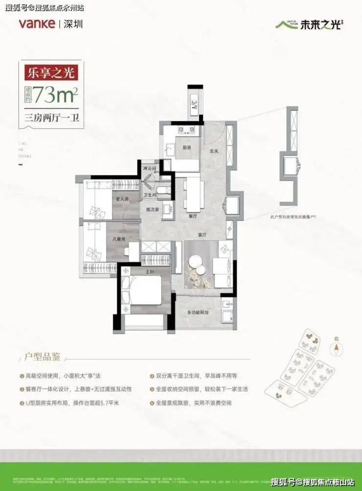 73㎡的3房2厅1卫,设计的是竖厅格局,进门入户玄关,LDKB一体化,S墙设计预留卡槽冰箱位,U型厨房,卫生间三段式分离,得房率79.63%(不含赠送),东北、西南或东南朝向。